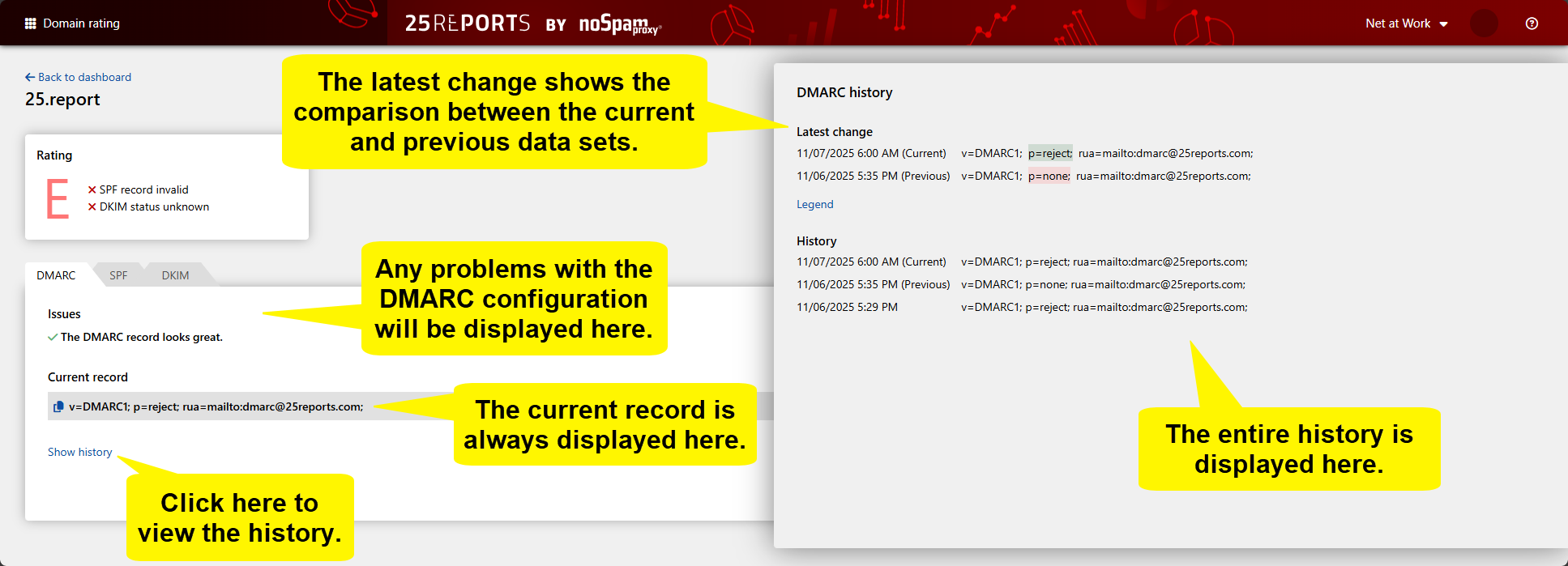 You can use the history to track changes and problems with your DMARC, SPF and DKIM entries. This is possible as soon as the corresponding domain has been verified.